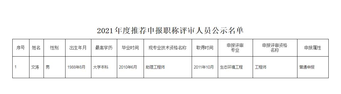经审核研究,同意推荐下列同志申报2021年度专业技术资格评审,现予公示。公示时间从2022年1月19日8:00至2022年1月26日18:00止(共七日)。若对下列同志申报专业技术资格有异议,请电话或书面向下述单位部门反映,反映情况的电话和书面材料要自报或签署真实姓名,不报或不签署真实姓名的,一律不予受理。